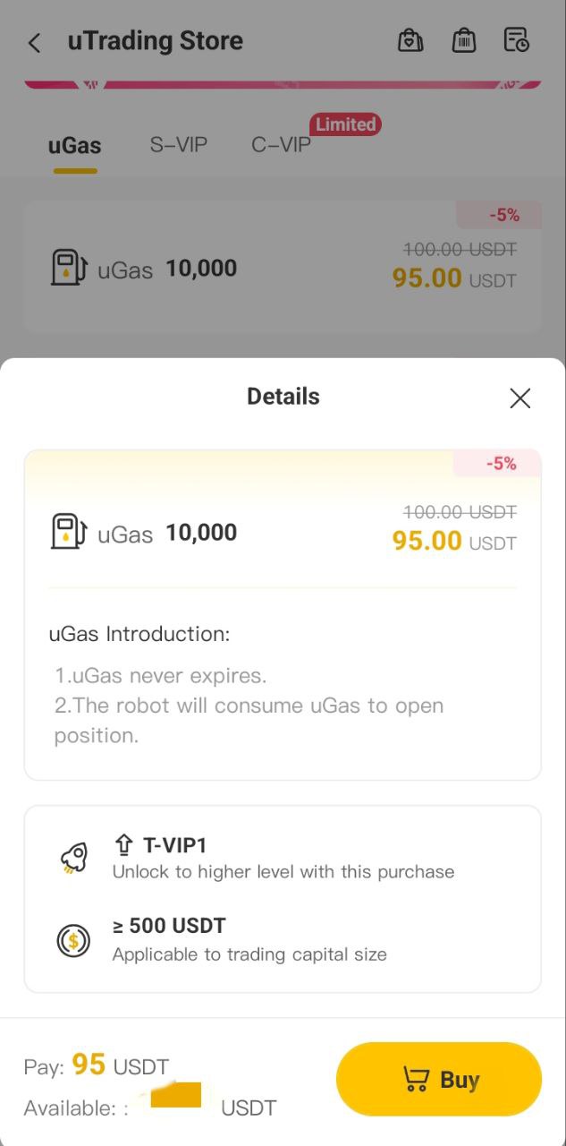 **Step 3:** Click **\[**<mark style="color:blue;">**Buy**</mark>**],** Once the purchase is completed, you can immediately see the uGas balance in your uTrading’s account.